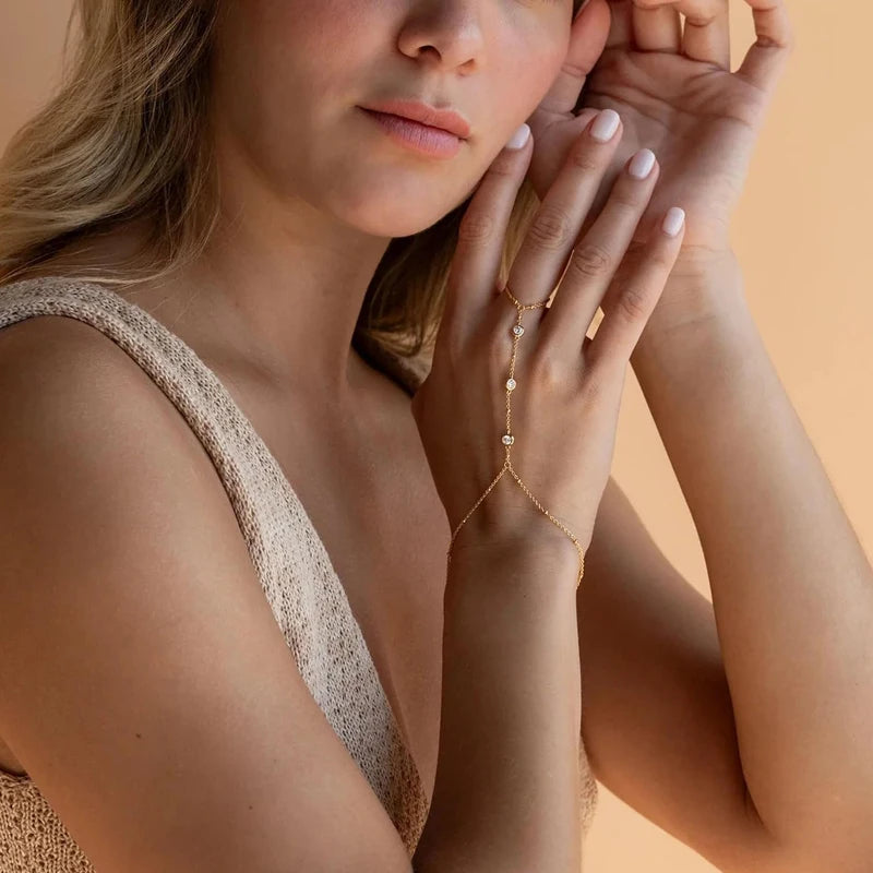 Dieses raffinierte Handkettchen kombiniert zeitlose Eleganz mit modernen Designelementen. Gefertigt aus hochwertigem vergoldetem Material, verläuft die filigrane Kette von einem zarten Fingerring über den Handrücken bis zum Handgelenk. Drei funkelnde Strasssteine fügen einen Hauch von Glamour hinzu, während das minimalistische Design eine elegante Optik bewahrt.